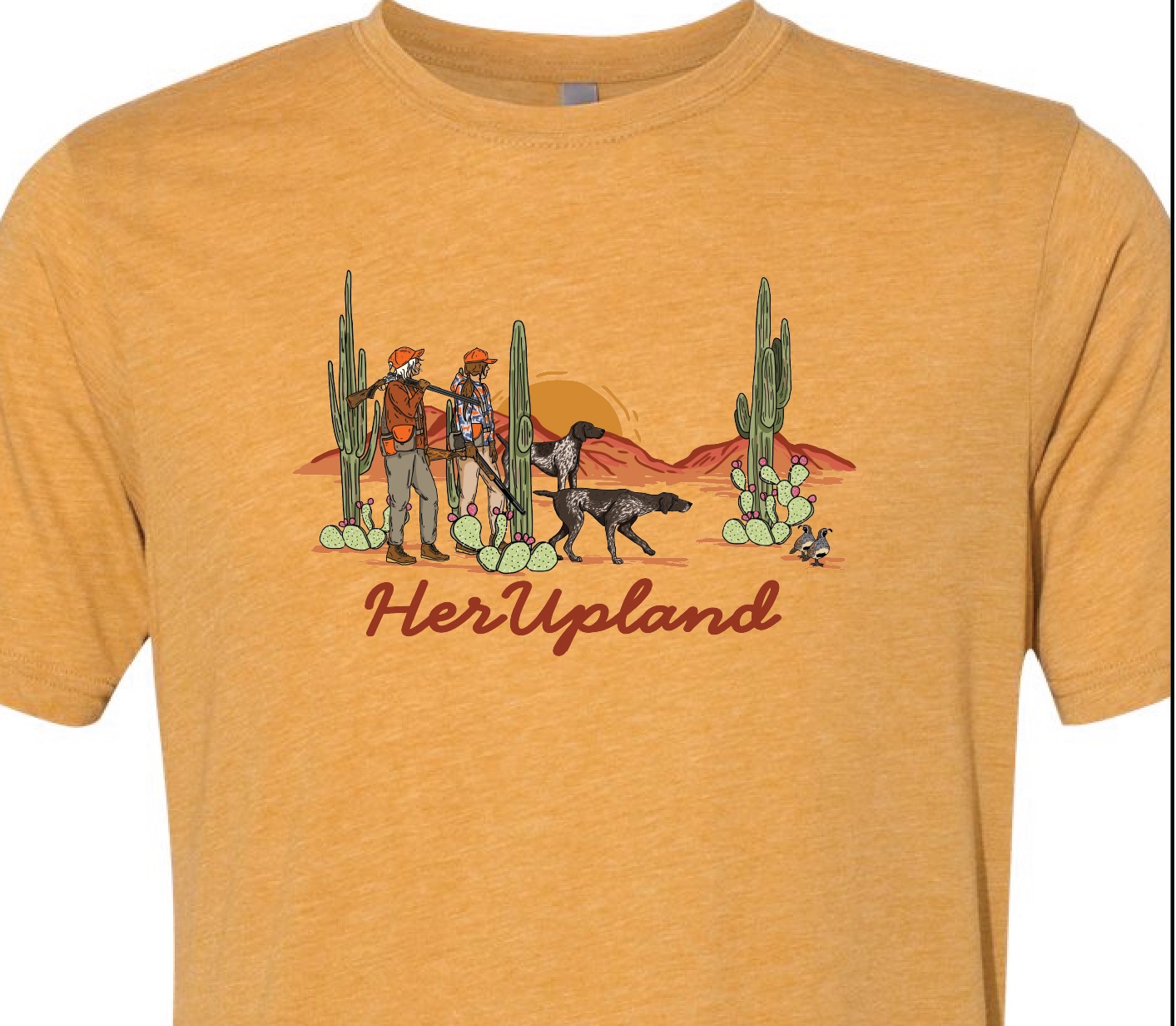 Step into the sun-soaked beauty of quail country with our Desert Quail Hunt Tee (Antique Gold). This original HerUpland design captures the spirit of a Southwest hunt—saguaro silhouettes, desert horizons, a bird dog on point, and that unmistakable covey-ready feel.